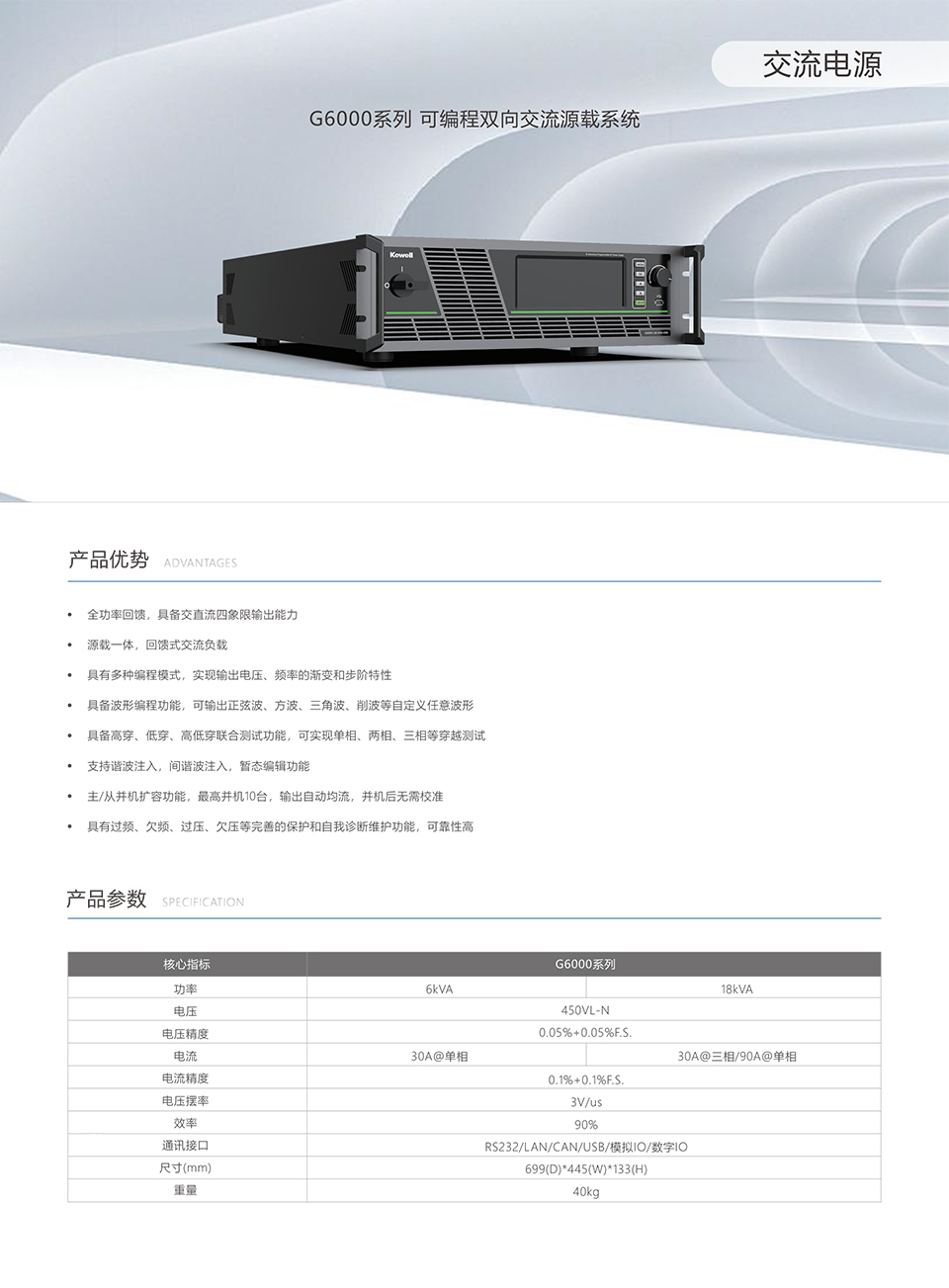 AC:谐波、闪变、短时中断等多种电网异常工况模拟。