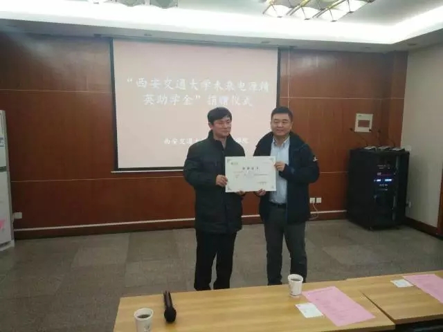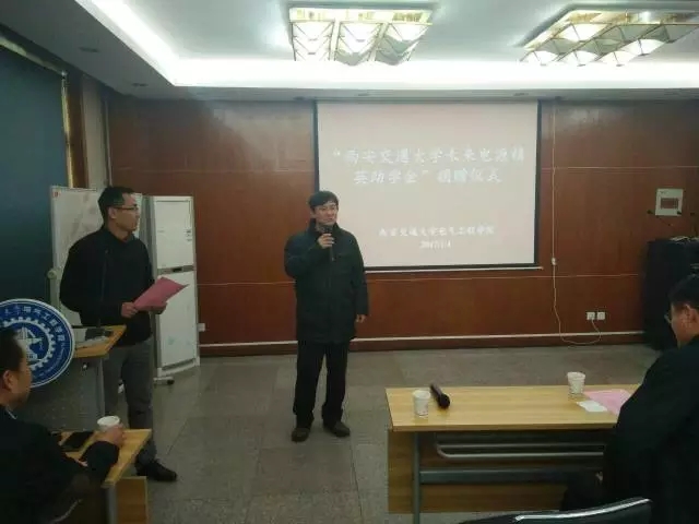 2017年1月4日上午,第二期“西安交通大学金年会未来电源精英助学金”捐赠仪式在电气工程学院北会议室顺利召开。本次捐赠仪式由西安交通大学电气学院党委副书记宋杰主持,出席仪式的捐赠方代表有:电源村村长代新社,亿曼丰科技(深圳)有限公司向总经理,合肥金年会电源系统有限公司总经理傅仕涛、研发经理唐德平,陕西金年会能源科技有限公司经理鲍鑫,合肥金年会电源系统有限公司助理汪艳,西安爱科赛博电气股份有限公司董事长白小青;出席仪式的西安交通大学领导有:电气学院副院长杨旭、电气学院党委副书记宋杰、电气学院学生工作主管高丹军、电气学院辅导员李茜。
