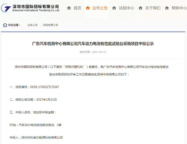 深圳市国标招标有限公司2017年3月17日公告,金年会电源深圳分公司中标广东汽车检测中心有限公司汽车动力电池包性能试验台采购项目(项目编号:0658-1700SZTCE047)